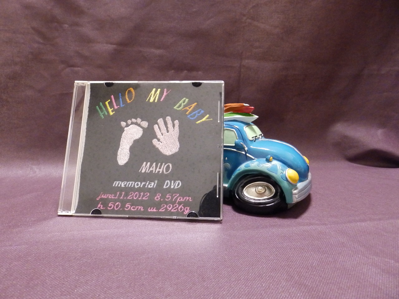 お子様・お孫様が誕生後、実寸の手形や足型のワッペンを作り、中に名前等の文字を刺繍します。