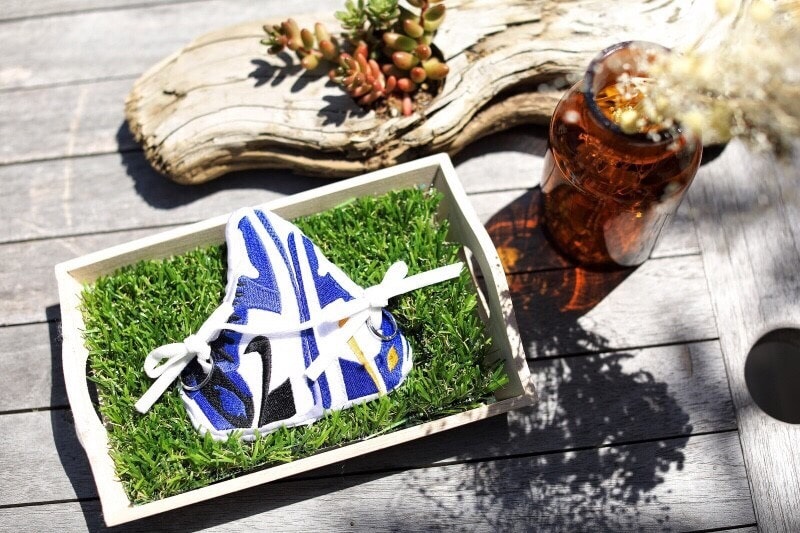 写真の雰囲気を再現して欲しいというご希望だったので、サテン生地にスニーカーを刺繍した後、立体的に見えるよう縫製、芝生に貼りました。新郎新婦の指輪はそれぞれ靴紐部分に結んであります。